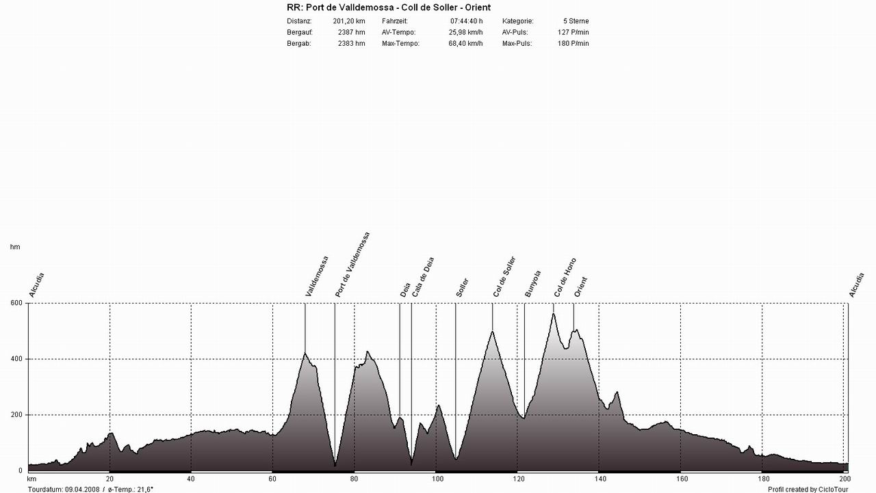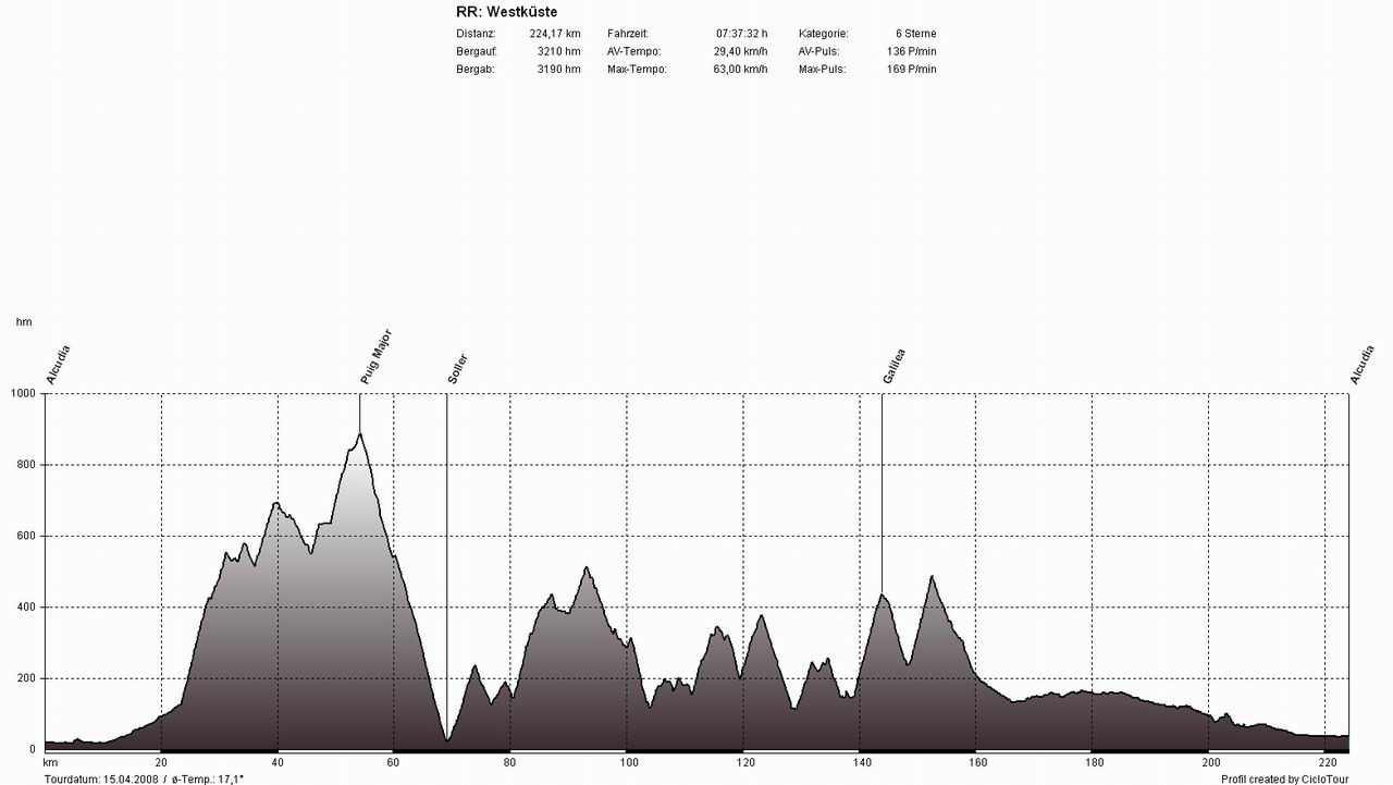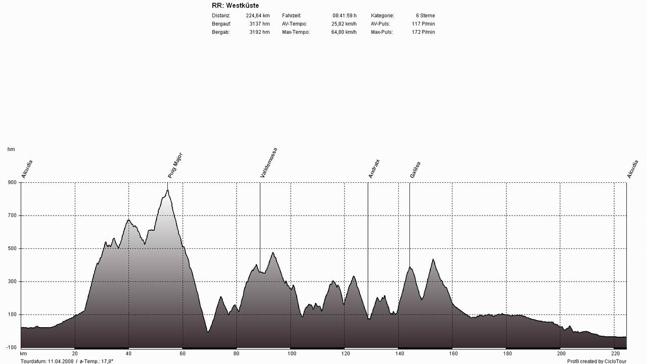 WestküsteTour: Alcudia - Pollenca - Puig Major - Soller - Deia - Valldemossa - Banyalbufar - Estellencs - Andratx - Capdella - Galilea - Puigpunyent - Esporles - S'Esglieta - Palmanjola - Santa Maria - Llubi - Sa Pobla - AlcudiaSchluss mit Lustig - der erste Westküstenklassiker stand an (hierbei wird auf der Westküstenstraße das komplette Tramuntana-Gebirge durchfahren). Je nach Windrichtung wählt man zuerst die Berge und eine flache Rückfahrt oder umgekehrt. In dieser Woche waren die Vorzeichen durch den sturmartigen Südwind jedoch eindeutig, wir fuhren erst gegen den Wind durch die Berge und dann mit Rückenwind flach zurück. Beim Berghoch- und Bergabfahren ist der Wind nicht annähernd so störend als auf den 60 flachen Kilometern zwischen Esporles und Alcudia. Bei dieser Variante gegen den Uhrzeigersinn beginnt das Martyrium in Pollenca und führt gleich zu Beginn über die höchste Straße der Insel, über den Puig Major. Hat man diesen mal geschafft, kommen (nur) noch unzählige kleine Anstiege zwischen Soller und Esporles.
