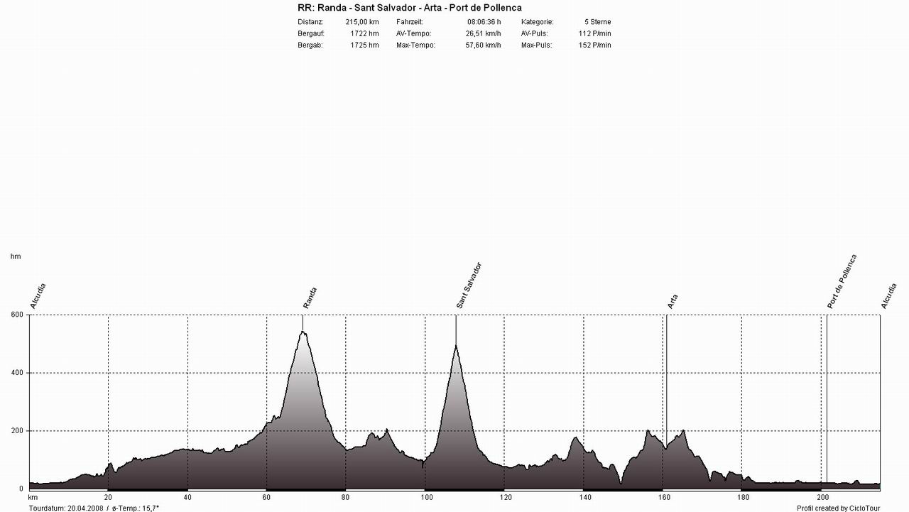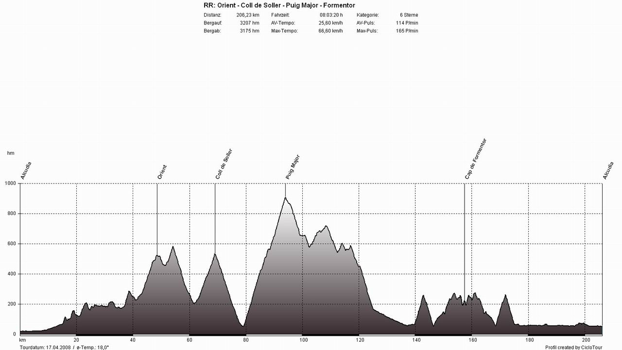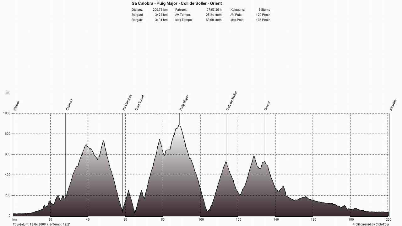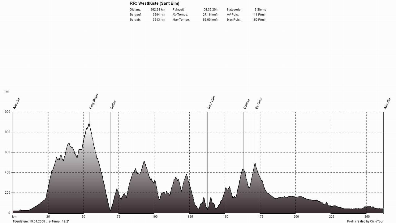 WestküsteTour: Alcudia - Pollenca - Puig Major - Soller - Deia - Valldemossa - Banyalbufar - Estellencs - Andratx - Capdella - Galilea - Puigpunyent - Esporles - S'Esglieta - Palmanjola - Santa Maria - Llubi - Sa Pobla - AlcudiaSchluss mit Lustig - der erste Westküstenklassiker stand an (hierbei wird auf der Westküstenstraße das komplette Tramuntana-Gebirge durchfahren). Je nach Windrichtung wählt man zuerst die Berge und eine flache Rückfahrt oder umgekehrt. In dieser Woche waren die Vorzeichen durch den sturmartigen Südwind jedoch eindeutig, wir fuhren erst gegen den Wind durch die Berge und dann mit Rückenwind flach zurück. Beim Berghoch- und Bergabfahren ist der Wind nicht annähernd so störend als auf den 60 flachen Kilometern zwischen Esporles und Alcudia. Bei dieser Variante gegen den Uhrzeigersinn beginnt das Martyrium in Pollenca und führt gleich zu Beginn über die höchste Straße der Insel, über den Puig Major. Hat man diesen mal geschafft, kommen (nur) noch unzählige kleine Anstiege zwischen Soller und Esporles.