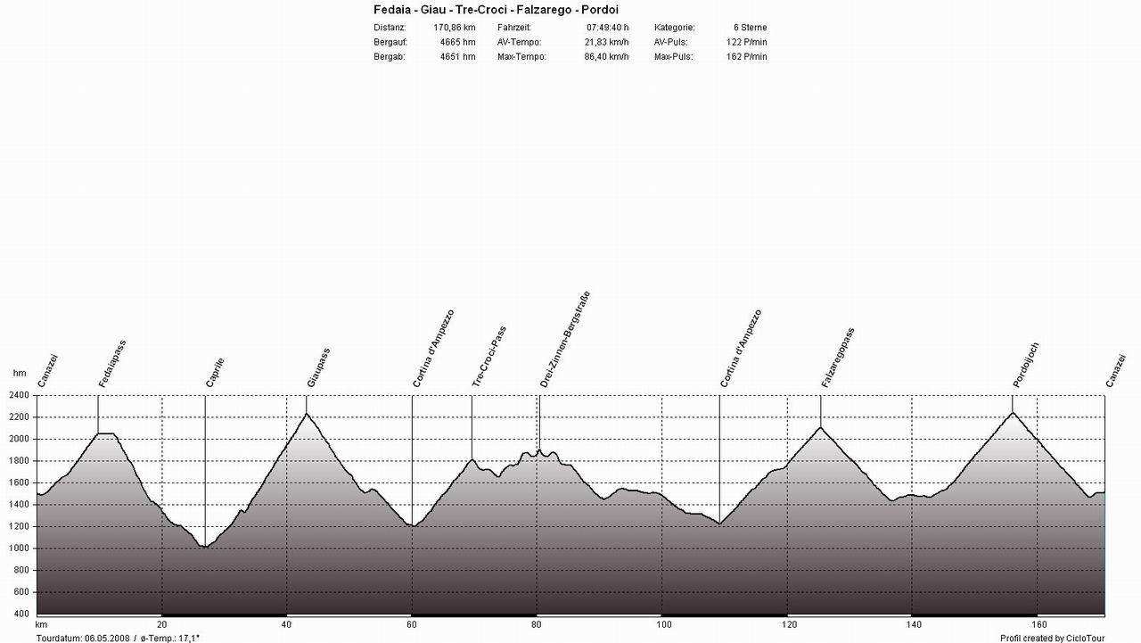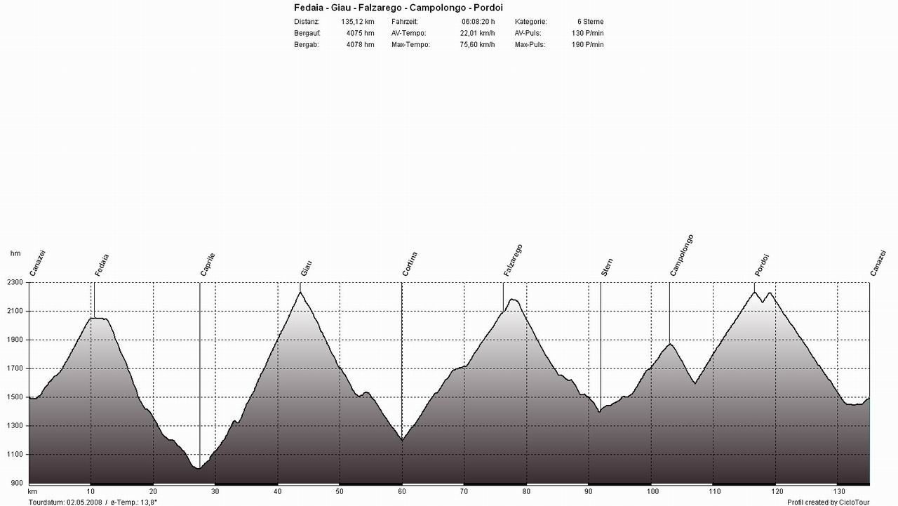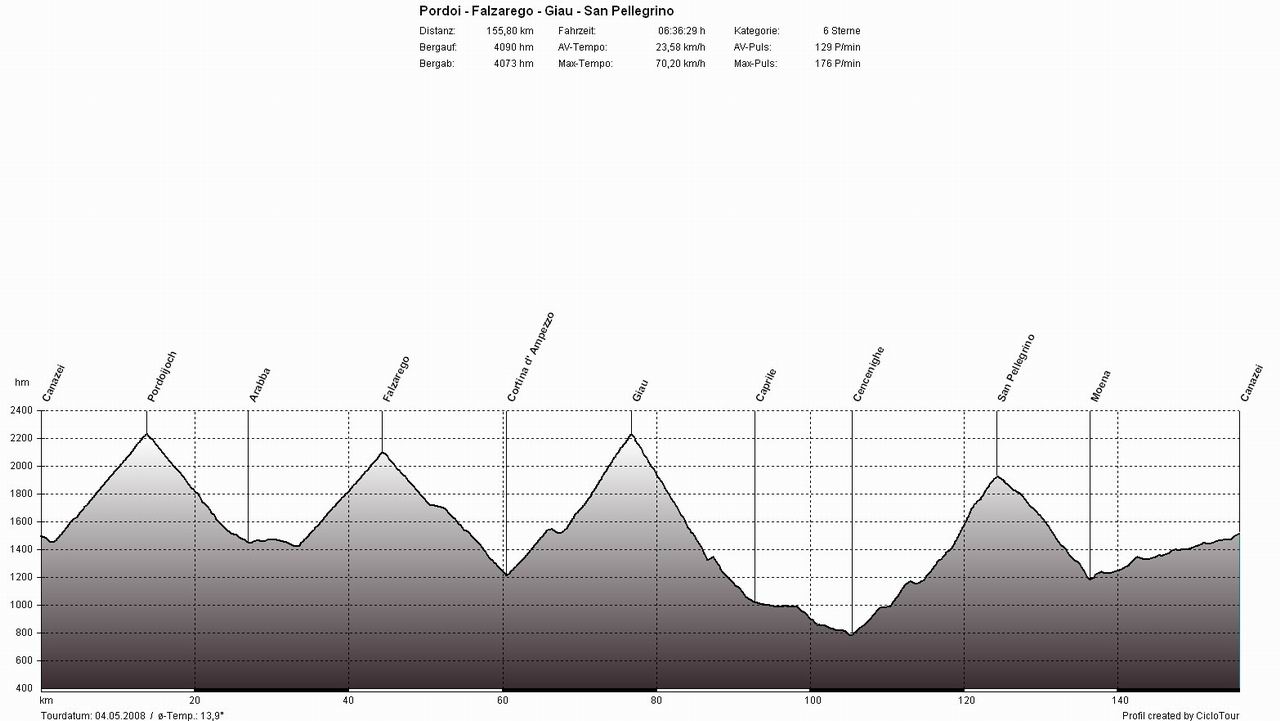 Pordoi - Falzarego - Giau - San PellegrinoTour: Canazei - Pordoijoch - Arabba - Andraz - Falzaregopass - Cortina d'Ampezzo - Giaupass - Selva di Cadore - Caprile - Alleghe - Cencenighe - Falcade - San-Pellegrino-Pass - Moena - Pozza - Campitello - CanazeiDie 15. Etappe des diesjährigen Giro D'Italia war Grundlage dieser Tourplanung. Ich wollte unbedingt mal die Pässe San Pellegrino und Giau verbinden. Da ich aber die Pässe Pordoi, Giau und Falzarego am Vortag in derselben Richtung wie die 15. Giro-Etappe gefahren bin, wollte ich die Tour in umgekehrter Richtung fahren. So stand am Morgen das Pordoijoch von Canazei aus an und danach folgte der Falzaregopass von seiner Westseite. Den Giaupass fuhr ich dann von Cortina aus und die anschließende Abfahrt führte mich nach Caprile. Den anstehenden Streckenabschnitt bin ich noch nie gefahren und war deshalb auch etwas gespannt. Der Ort Caprile war bis jetzt immer der niedrigste Punkt, mit einer Meereshöhe von 1.000 Metern, aber diese neue Route führte mich nach Cencenighe und das lag auf 780 Höhenmetern.