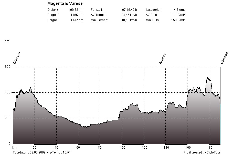 Magenta & VareseTour: Balerna - Faloppio - Castellanza - Magenta - Castelletto - Angera - Ispra - Varese - Induno - Viggiu - BalernaDas Tagesziel war, möglichst schnell und unkompliziert in Richtung Poebene zu gelangen. Behindert wurde dies bereits nach ein paar Kilometern durch einen großer Markt. Dieser Ort war leider nicht leicht zu umfahren und so mussten wir unser Fahrrad ca. 20 Minuten durch italienische Menschenmassen schieben. Kurz darauf fuhren wir durch ein langes Waldstück, in dem alle 500 Meter leichtbekleidete schwarze Damen ihre Dienstleistungen anboten. Was das genau für Dienstleistungen waren, konnte ich nicht hundertprozentig feststellen - wahrscheinlich verkauften sie Speisepilze aus dem Wald oder gehörten zur regionalen Forstverwaltung :-) Wir ließen uns jedoch nicht ablenken und setzten unsere Fahrt unbeirrt fort. Bereits ein paar Kilometer weiter, wurden wir durch eine neues Problem ausgebremst. Wir mussten in der Nähe von Mailand mehrere Großstädte passieren, was sich als sehr kompliziert und zeitaufwendig herausstellte. Ein Hoch auf die italienische Verkehrsbeschilderung! Als dies geschafft war, eröffnete sich uns der Blick auf die Weiten der Poebene. Leider hatten wir bereits einige Kilometer auf dem Tacho, so dass wir nicht mehr viel weiter nach Süden radeln konnten. Bei Magenta drehten wir dann wieder um und suchten einen im Internet angepriesenen Radweg, welcher an einem Fluss entlang bis zum Lago Maggiore verlaufen sollte. Nach ein paar Fehlversuchen haben wir ihn dann doch noch gefunden. Diesem Radweg folgten wir ein ganzes Stück, die restlichen Kilometer bis zum Lago Maggiore legten wir jedoch wieder auf der Hauptstraße zurück. In Angera machten wir unsere längst überfällige Kaffeepause und waren uns darüber einig, die letzten Kilometer noch locker abspulen zu können. Leider war das eine Fehleinschätzung.