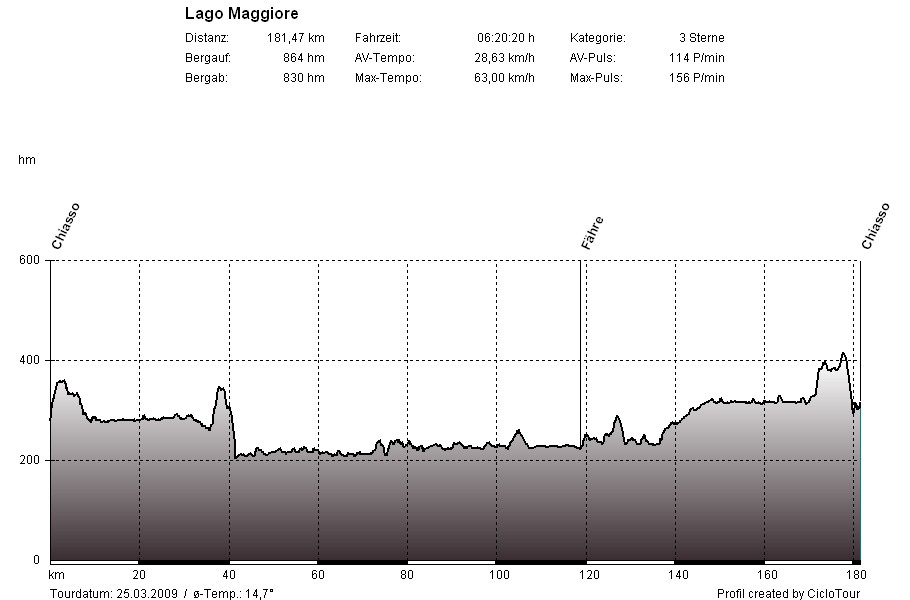 Von Luino aus sind wir der Straße am See in Richtung Norden gefolgt. Auf der Westseite mussten wir uns dann noch durch die größeren Städte Locarno und Ascona navigieren, bevor wir wieder stressfrei am See entlang fahren konnten. Nach einer kurzen Riegelpause haben wir das Tempo etwas erhöht und zufällig gerade noch die Fähre in Verbania erreicht. Die Fährfahrt bescherte uns eine kurze Pause, einen Kaffee und ein süßes Stückchen. Auf der anderen Seite sind wir in Laveno wieder an Land gegangen bzw. gefahren und mussten nun auf der Lago-Ostseite 20 wellige Kilometer in nördlicher Richtung zurücklegen. In Luino angekommen, haben wir diesmal die schweizer Straße nach Ponte Tresa ausgewählt. Insgesamt war dies eine sehr gelungene Trainingsrunde, da die guten Straßen und die geringen Höhenmeter ein gleichmäßiges Radeln im Grundlagenbereich zuließen.
