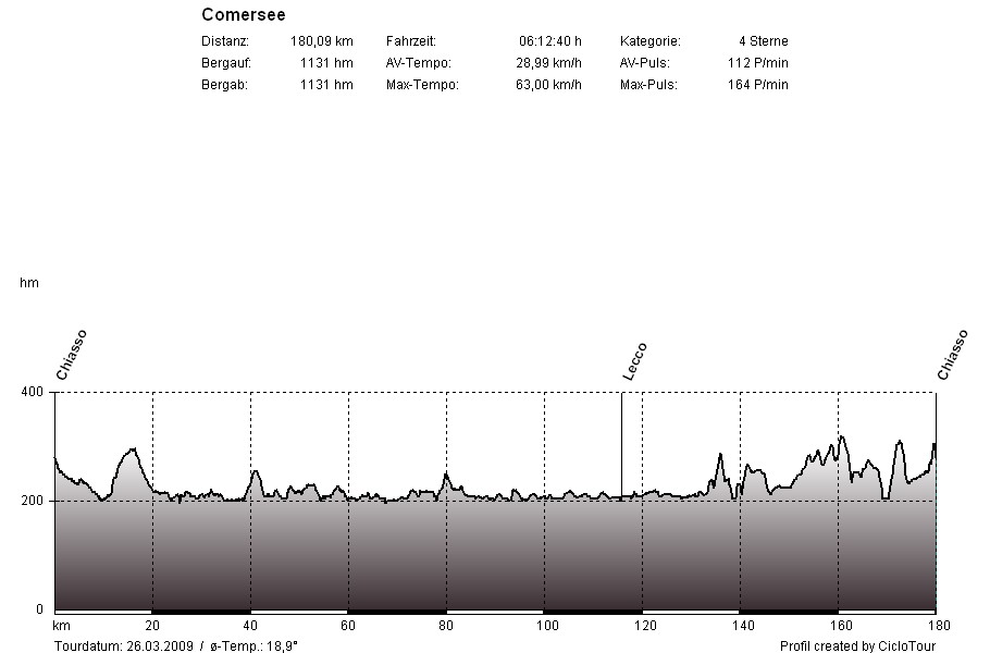 ComerseeTour: Balerna - Como - Cernobbio - Brienno - Lenno - Menaggio - Dongo - Gravedona - Colico - Bellano - Mandello del Lario - Lecco - Bellagio - Como - BalernaBei dieser Tour müsste man eigentlich ohne Worte auskommen und nur die Fotos sprechen lassen. An diesem Tag ging mit der Sonne auch mein Radlerherz auf, endlich mal wieder in KURZ radeln. Meine Endorphine (Glückshormone) fuhren Achterbahn - eine wunderschöne Tour bei genialem Wetter.