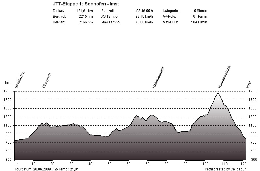 Sonthofen - ImstAller Anfang ist schwer - die erste Etappe verlief leider nicht ganz ohne Komplikationen. Wie schon erwähnt hatte Hans bereits die letzten Tage mit einem Magen-Darm-Infekt zu kämpfen - leider während der 1. Etappe immer noch ;-( Er hat sich aber mehr als wacker geschlagen und wir mussten lediglich am Hahntennjoch die schnellen Jungs ziehen lassen. Schlussendlich sind wir (mit etwa 12 Minuten Rückstand auf die Spitze) 21. der Kategorie Herren geworden.