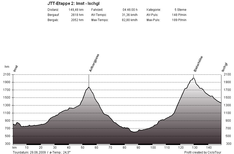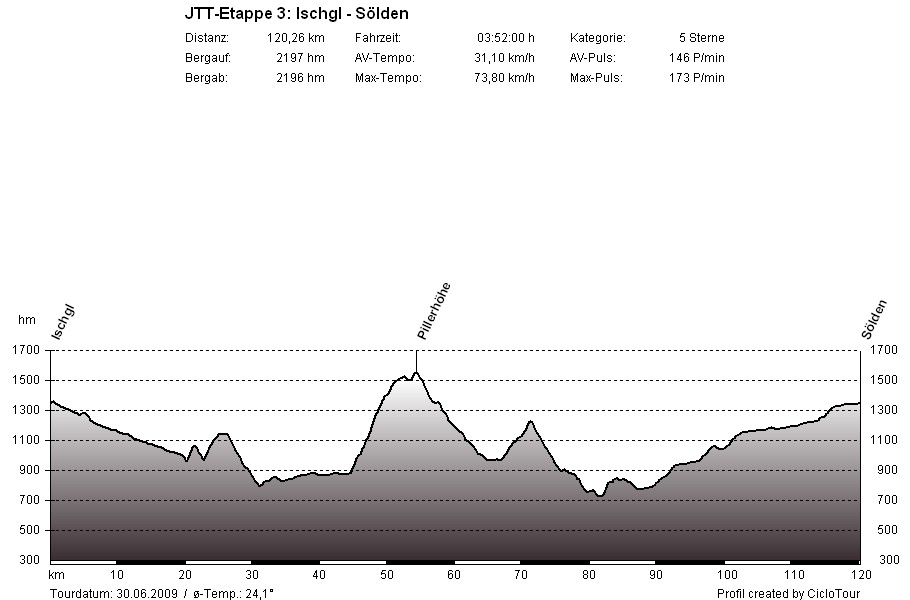 Ischgl - SöldenDie vermeintlich einfache Etappe hatte einen großen und ein paar kleinere giftige Anstiege zu bieten. Trotz alledem lief es bei mir recht gut, leider war Hans noch nicht im Vollbesitz seiner Kräfte. So mussten wir die Spitzengruppe und 2 Verfolgergruppen ab der Pillerhöhe ziehen lassen. Wir befanden uns jedoch auch in einer sehr großen und auch vermeintlich schnellen Gruppe - leider nur vermeintlich. Denn in dieser Gruppe lief das Ötztal hinauf rein gar nichts. Nachdem es mir gut ging und ich mich anbot die Führungsarbeit zu übernehmen, hielten es die Herren dieser Gruppe nicht mal für nötig bei dieser immer noch moderaten Geschwindigkeit im Windschatten mitzufahren. Einigen Ärger und Frustattacken später kamen wir dann in Sölden an und plötzlich gab es wieder Teams, welche aus heiterem Himmel neue Kraftreserven freisetzten und um ihr Leben sprinten konnten. Egal - Hans ist fast wieder komplett genesen, aber ihm fehlen nach seinem Magen-Darm-Infekt die Kräfte, für solche Anstrengungen Tag für Tag.