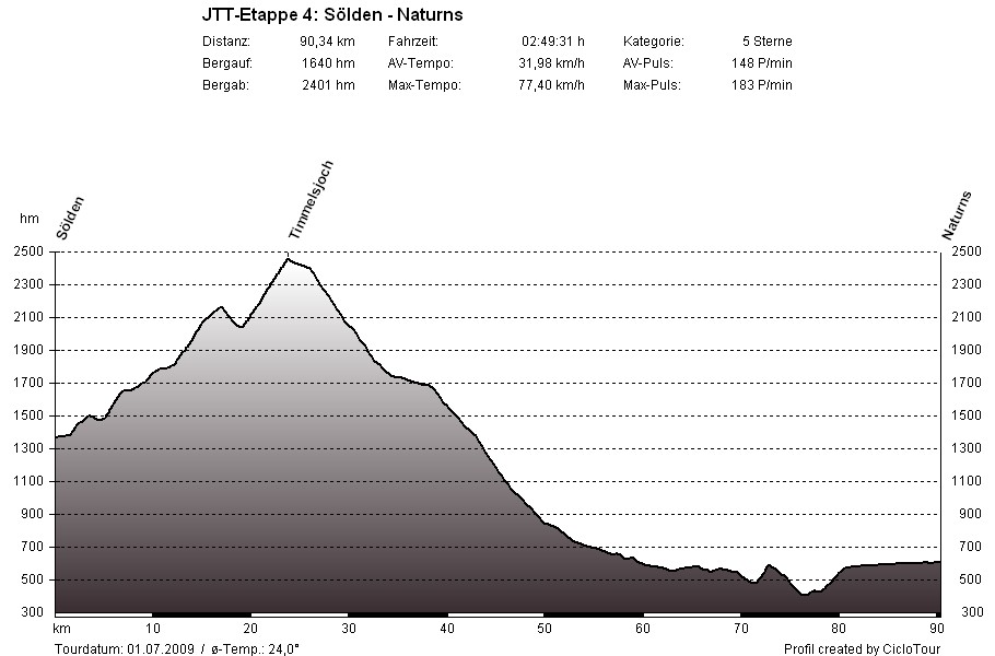 Keine Veränderung zum Vortag - leider musste Hans auch am Timmelsjoch noch seiner krankheitsbedingten Schwächung Tribut zollen. So mussten wir eine für uns nicht unwichtige Gruppe ziehen lassen und uns mit der nächsten Gruppe zufrieden geben. Danach passierte nichts überraschendes mehr, wir fuhren im Flachen meist wieder zu langsam und konnten nach vorne weder Zeit gutmachen noch jemand einholen. Uns blieb leider nichts anderes übrig, als Tag für Tag wieder auszuloten, ob Hans sich vollständig regeneriert hat. Nun standen die zwei mit Abstand schwersten Etappen an und es musste sich zeigen, ob sich das für uns positiv oder negativ auswirken sollte. Speziell im Hochgebirge, bei über 3.000-Höhenmeter-Etappen, muss man schon hundertprozentig gesund und fit sein um eine ordentliche Zeit fahren zu können. Morgen wissen wir mehr ;-)