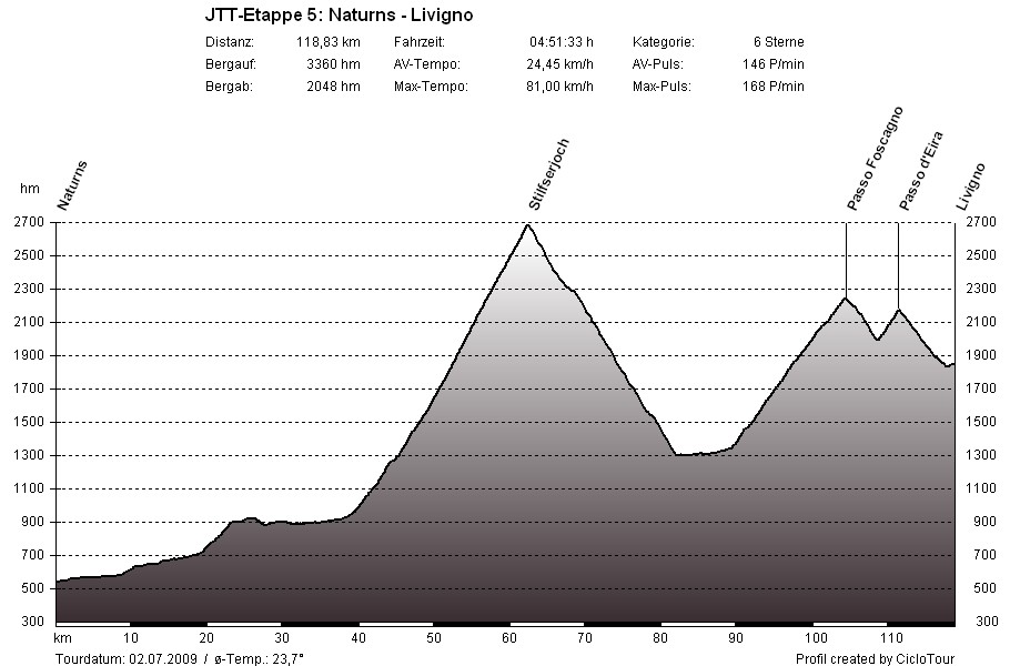 Naturns - LivignoHeute sind wir über das Dach der Tour gefahren, das Stilfserjoch. Ich bin diesen Pass ja schon öfters gefahren, aber er scheint immer länger (oder ich älter) zu werden ;-) Jedenfalls haben wir das richtige Tempo gefunden und sind schön gleichmäßig, aber dennoch mit Schmerzen, den Pass hochgefahren. Im oberen Teil fing es noch an zu regnen, was zu Beginn noch abkühlend wirkte, wandelte sich später auf der Passspitze und der darauffolgende Abfahrt jedoch in Kälte. Ein paar Kehren und Höhenmeter weiter unten, wurde es jedoch schon wieder wärmer. Nach der schnellen Abfahrt konnten wir unten in Bormio gerade noch auf eine Gruppe auffahren und mit dieser gemeinsam die ca. 7 flachen Kilometer bewältigen. Direkt vor dem Anstieg zum Passo Foscagno war die 2. Verpflegungsstation postiert. Hier hab ich beide Trinkflaschen mit Wasser auffüllen lassen und noch schnell 3 kleine Stück Kuchen verschlungen ;-) Unsere Gruppe war natürlich somit weg, aber ab da ging es so oder so nur noch bergauf und bergab. Wir fanden wieder unser Tempo und der Passo Foscagno, welchen wir beide nicht kannten, stieg zum Glück nur sehr moderat an. Knapp unter 5 Stunden sind wir dann (mit uns zufrieden) in Livigno angekommen. Kurz nach unserer Zieleinfahrt fing es dann an, aus vollen Kübeln zu regnen. Wir hatten das Glück und sind trocken geblieben, aber es waren ja noch Hunderte an den beiden letzten Pässen unterwegs. Da verspürt man als Radfahrer und Leidensgenosse schon Mitleid mit den Anderen.