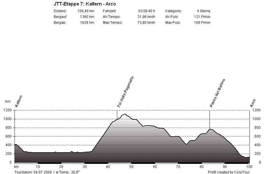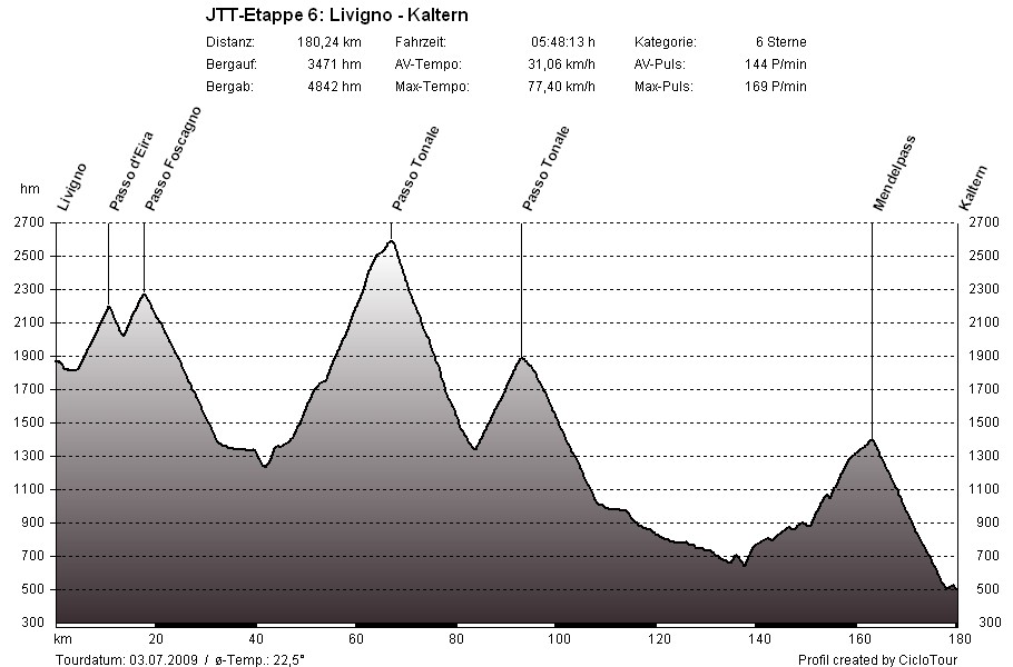 Livigno - KalternDie Königsetappe sind wir königlich gefahren ;-) Hans ist wieder vollständig genesen und so konnten wir bei der längsten und steilsten Etappe in der Transalp-Geschichte unsere erste Top-Ten-Platzierung einfahren. Mit einer sehr großen Gruppe sind wir über den Passo d'Eira, Foscagno, Gavia und Tonale gefahren. Auf den letzen Höhenmetern zum Mendelpass hat es unsere Gruppe etwas auseinandergerissen. Ich für meinen Teil bin aus der Gruppe als erster über die Passspitze gefahren und habe mich dynamisch in die regennasse Abfahrt gestürzt. Ohne übergroßes Risiko konnte ich sofort einen kleinen Vorsprung rausfahren, der Kehre für Kehre immer größer wurde. Etwas weiter oben habe ich Hans und noch einen Fahrer als nächste Verfolger gesehen. Ich dachte zu diesem Zeitpunkt, dass die Abfahrt direkt ins Ziel nach Kaltern führen würde, leider war dem nicht so. Im Folgenden habe ich noch ein paar Fahrer überholt und als mir klar wurde, dass es noch flach und somit eine Gruppe wichtig werden könnte, fuhr ich auf das Team "RSV Concordia Forchheim Sunos" auf. Mit denen habe ich dann total erschöpft und ausgetrocknet das letzte Flachstück bewältigt. Mit der Hoffnung, dass Hans auch sturz- und pannenfrei runtergekommen ist und noch Helfer für das Flachstück gefunden hat, wartete ich gespannt im Zielbereich. Hans konnte sich tatsächlich durchsetzen und überfuhr als nächster Fahrer die Ziellinie. Somit waren wir aus unserer Tagesgruppe die schnellsten, was mit Platz 7 in der Tages- und Platz 14 in der Gesamtwertung der Herren belohnt wurde :-) Den Gesamtplatz 14 gilt es Morgen noch gegen die Teams "Kopfjäger-Sports 1" und "Odense" zu verteidigen.